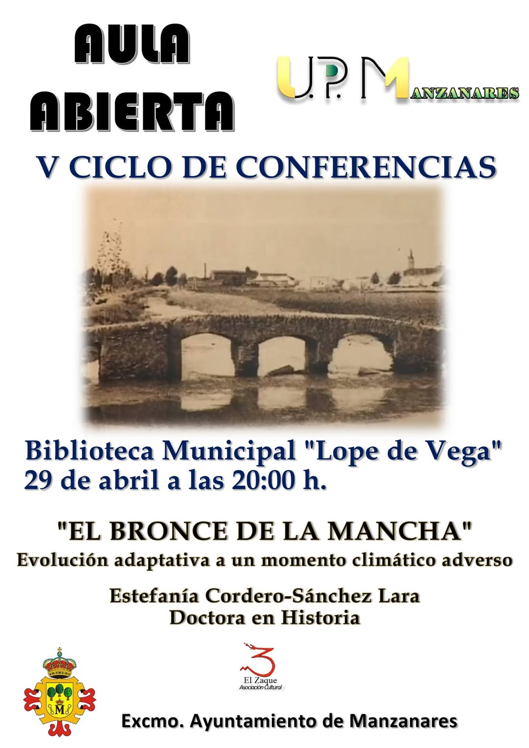 El próximo 29 de abril, a las 20:00 horas, en la Biblioteca Municipal “Lope de Vega”, se celebrará una nueva edición de la Aula Abierta, una serie de conferencias y actividades educativas puestas en marcha por la Asociación Cultural “El Zaque”. En esta ocasión, la ponencia lleva por título “El bronce de La Mancha. Evolución adaptativa a un momento climático adverso”.