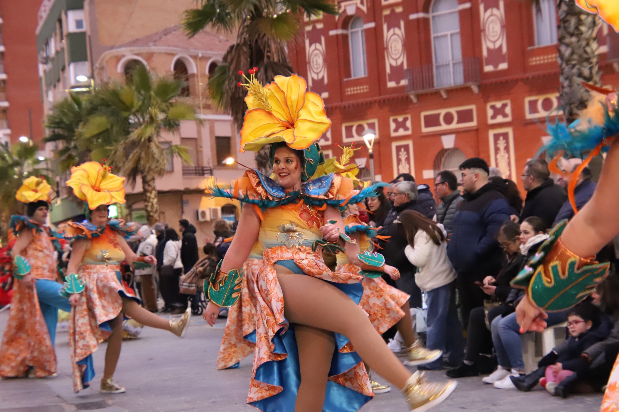 Otra imagen captura a una de las alegres comparsas en plena actuación, con sus vibrantes atuendos y una energía contagiosa. En otro instante capturado, se puede apreciar el detalle minucioso y el trabajo artesanal que se invirtió en los disfraces y los accesorios utilizados por los participantes.