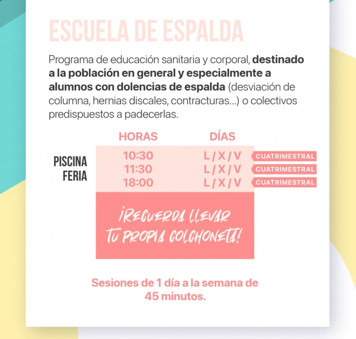 Así lo ha informado el Instituto Municipal de Deportes del Ayuntamiento de Albacete. Este es un programa de educación sanitaria y corporal para aquellas personas que padecen dolencias de espalda que pueden ser causadas por contracturas, desviación de la columna, hernias discales, entre otras. Esta se lleva a cabo a través de sesiones de 45 minutos 1 día a la semana. La misma se lleva a cabo en la piscina de feria.