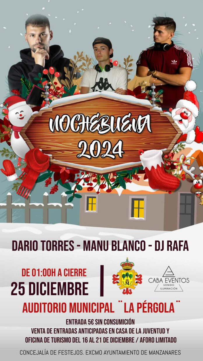 Los maestros de ceremonia que tienen la importante tarea de animar estas dos noches de fiesta son Darío Torres, Manu Blanco, Dj Rafa y Condés. Serán los encargados de poner la mejor música y el mejor ambiente para brindar y celebrar la Navidad y el Año Nuevo en Manzanares.