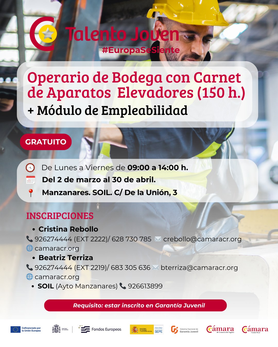 Se anuncia un nuevo curso Operari@ de Bodega con Carnet de aparatos elevadores. Esta formación consta de 150 horas de clases teóricas y prácticas, además de un módulo de empleabilidad diseñado para potenciar las capacidades laborales de los participantes. El curso está promovido por la Cámara de Comercio de Ciudad Real en colaboración con el Ayuntamiento de Manzanares.