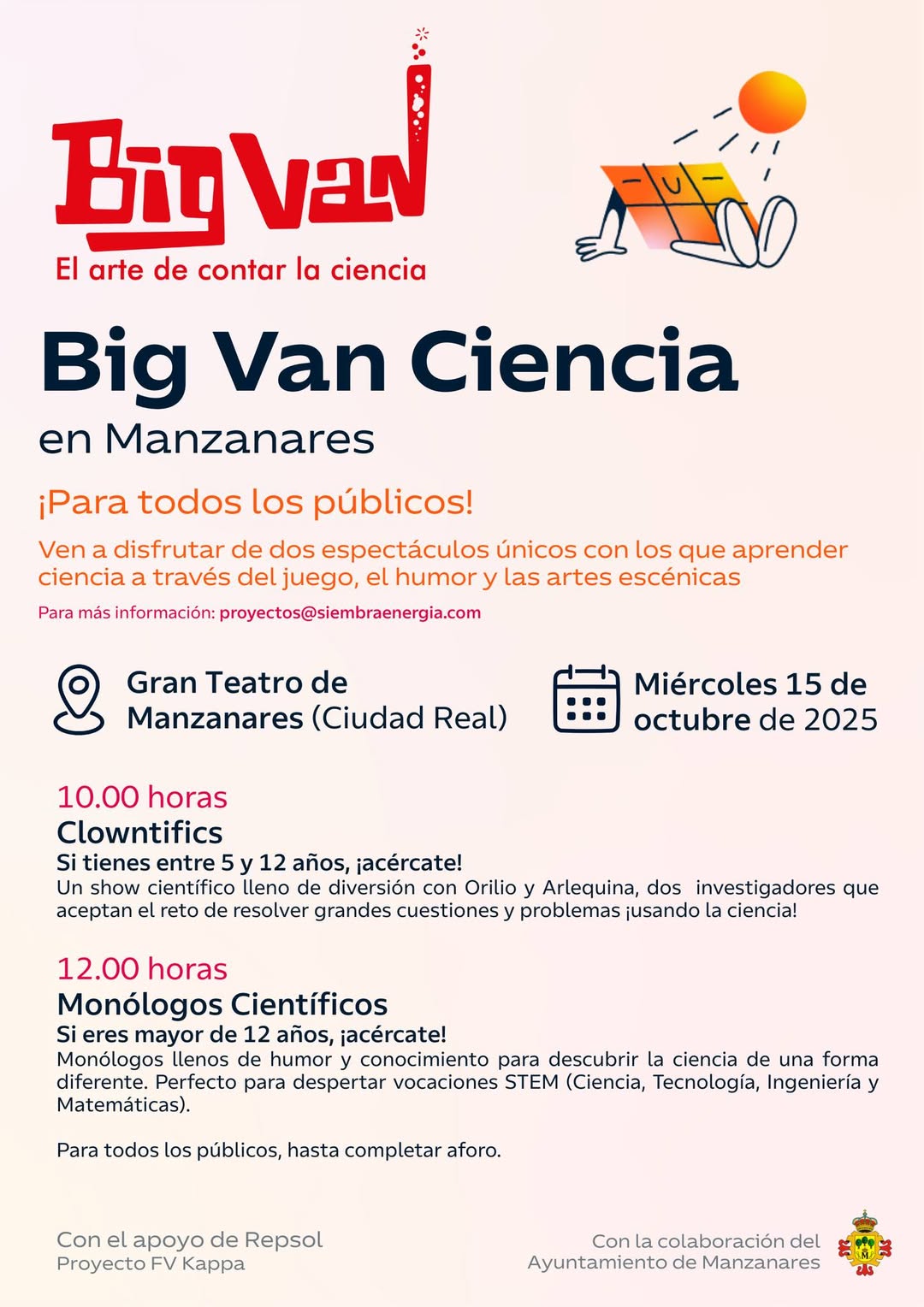El Departamento de Educación del Ayuntamiento de Manzanares tiene el placer de anunciar un evento especial a realizarse el próximo miércoles 15 de octubre en el Gran Teatro. Serán dos actividades destacadas después de un largo tiempo, y estarán a cargo del renombrado grupo de artes escénicas Big Van Ciencia.