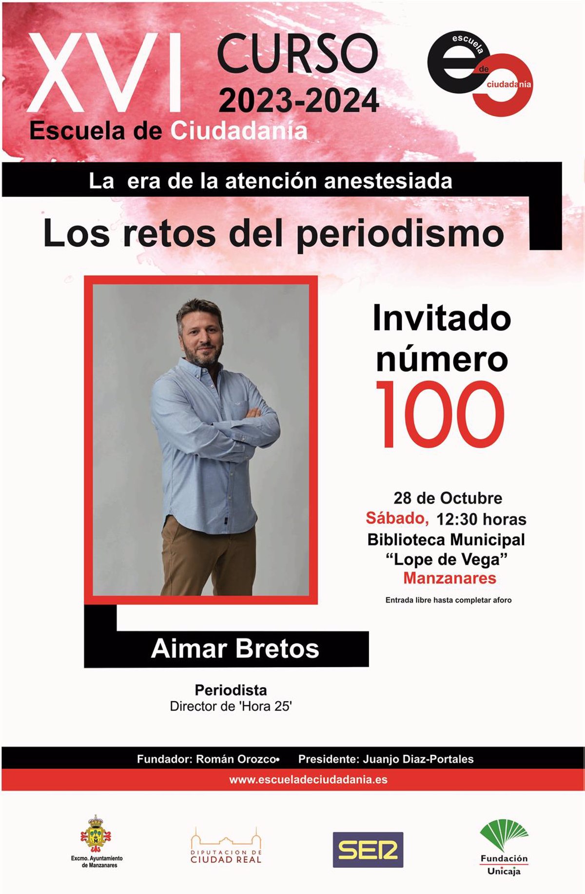 El próximo sábado 28 de octubre dará comienzo el 16º curso de la Escuela de Ciudadanía en Manzanares. El encargado de inaugurar este nuevo ciclo será el reconocido periodista Aimar Bretos, quien impartirá una conferencia titulada ‘Los retos del periodismo en la era de la atención anestesiada’.