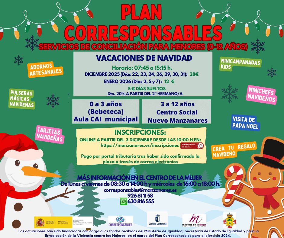El Plan Corresponsables tiene como finalidad brindar un servicio de conciliación de la vida laboral y familiar en especial para estos días festivos cuando los niños no tienen colegio. Este servicio está dirigido a menores de 0 a 12 años y estará disponible durante los días laborables no lectivos de las fiestas navideñas.