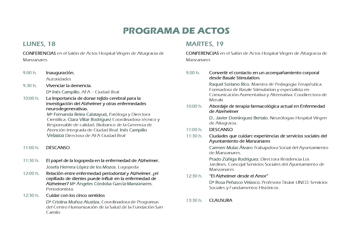 Según ha destacado Zúñiga, habrá conferencias de “marcado carácter sanitario”, como una sobre la importancia de donar tejido cerebral para la investigación del Alzheimer y de otras enfermedades neurodegenerativas; otra a cerca de la terapia farmacológica, así como también en relación a la higiene bucodental, la deglución y el lenguaje; los cuidados o la comunicación corporal y a través del contacto.