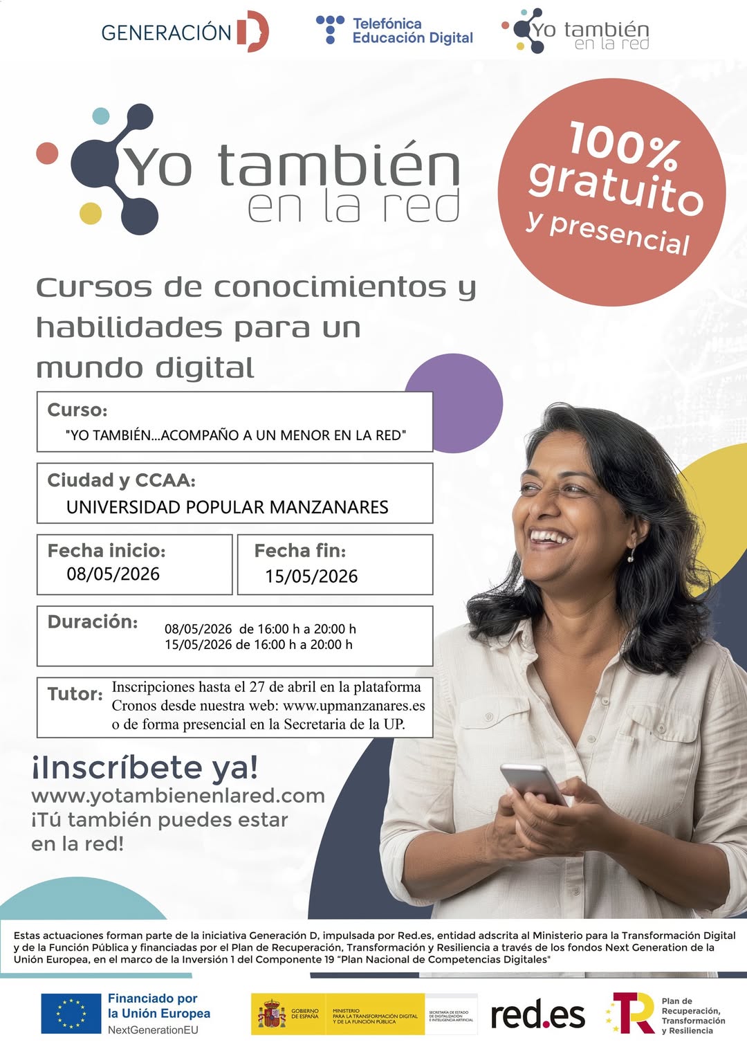 Este valioso curso es promovido por Red.es, entidad adscrita al Ministerio para la Transformación Digital, y por Telefónica Educación Digital. Consistirá en dos sesiones que tendrán lugar en las instalaciones de la Universidad Popular, ambas en horario de 16:00 a 20:00 horas.