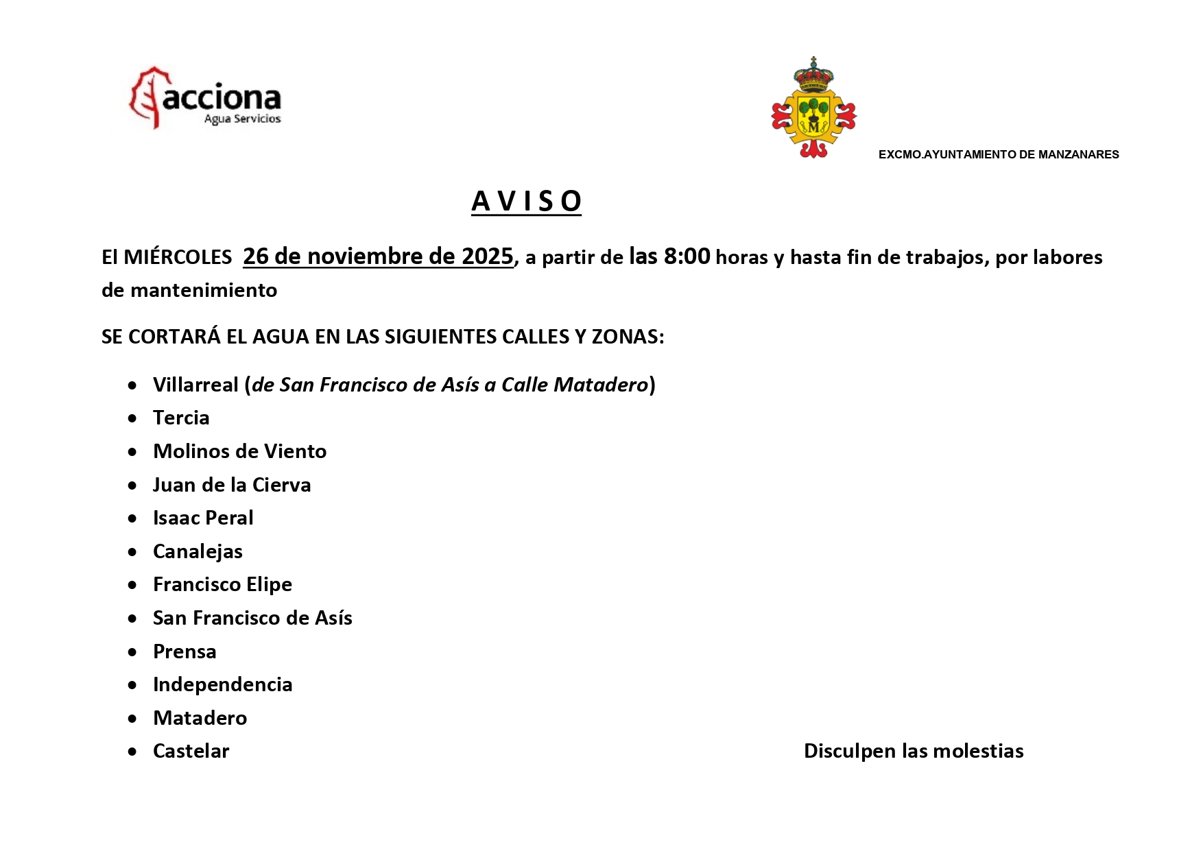 La empresa de gestión del agua, Acciona Agua, ha anunciado que llevará a cabo trabajos de mantenimiento este miércoles 26 de noviembre de 2025, lo que ocasionará un corte de agua en 12 calles del municipio. Los cortes comenzarán a partir de las 8:00 horas y se prolongarán hasta el fin de los trabajos.