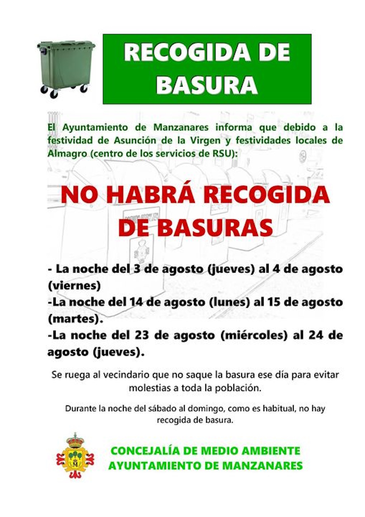 Por celebración de la festividad de la Asunción de la Virgen, el ayuntamiento de Manzanares (Ciudad Real) ha informado que no habrá recogida de basura del 14 al 15 de agosto en la localidad.