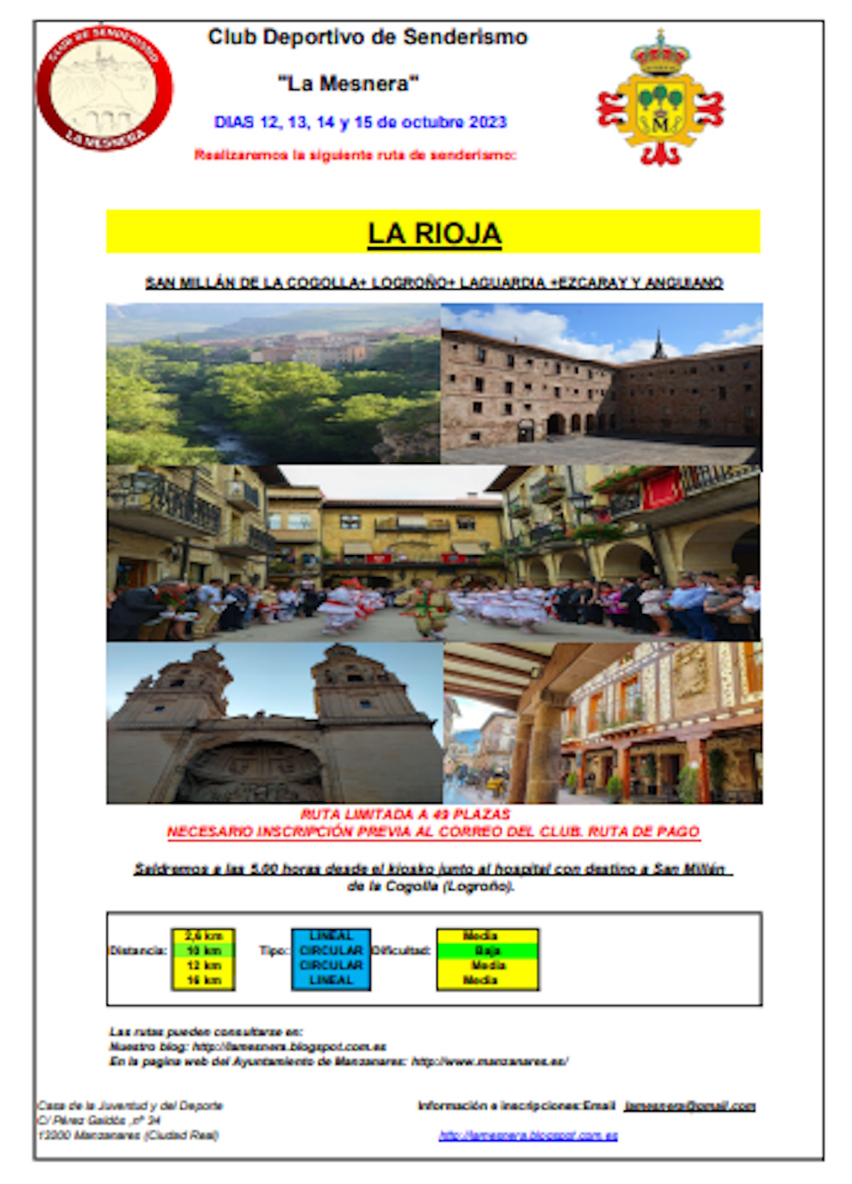 Una ruta de senderismo a San Millán de la Cogolla+Logroño+Laguardia+Ezcaray y Anguiano se llevará a cabo los días 12, 13 y 15 de octubre, organizada por el Club Deportivo “La Mesnera” de Miguelturra (Ciudad Real).