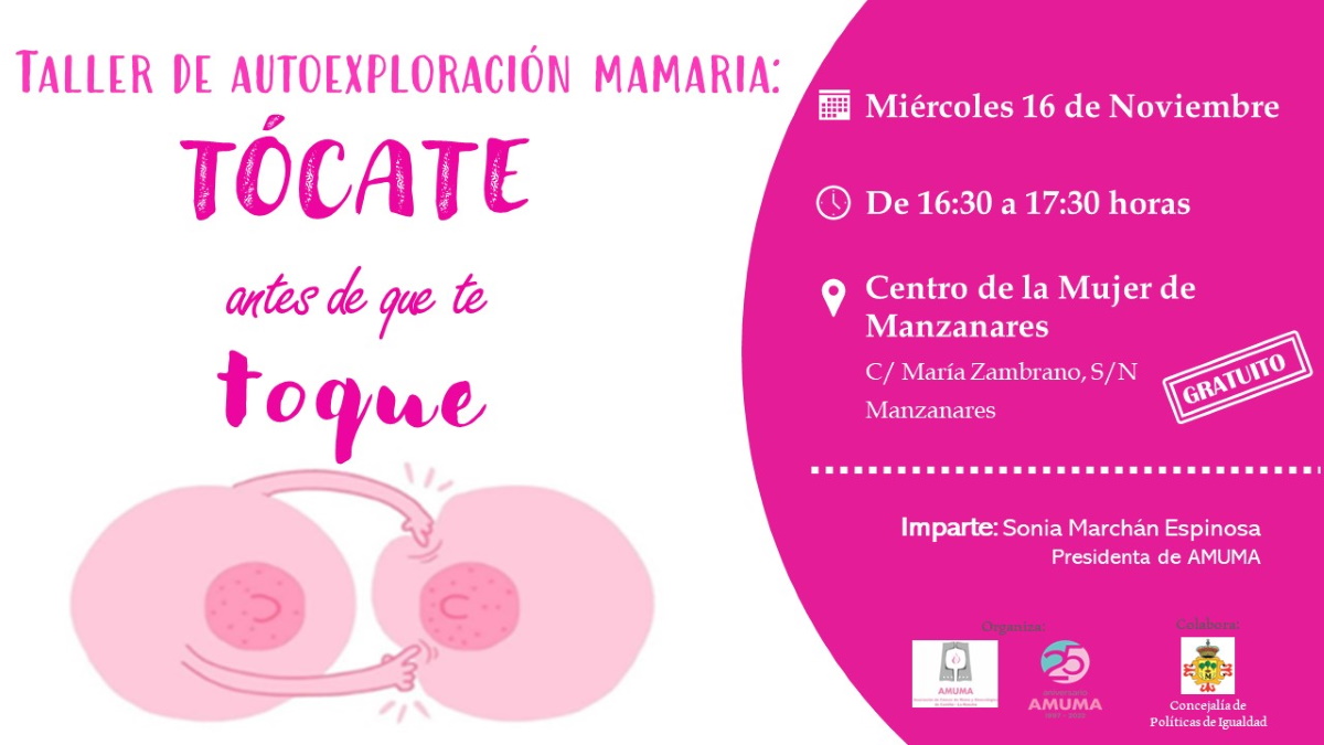 Como hemos mencionado, el Centro de la Mujer acogerá mañana (16 de noviembre) esta actividad de 16:30 a 17:30 horas. Bajo el título “Tócate antes de que te toque”, en ella se explicará paso a paso el proceso para realizarse una autoexploración y para detectar los primeros signos y síntomas de alerta ante los que hay que acudir rápidamente al médico de cabecera.