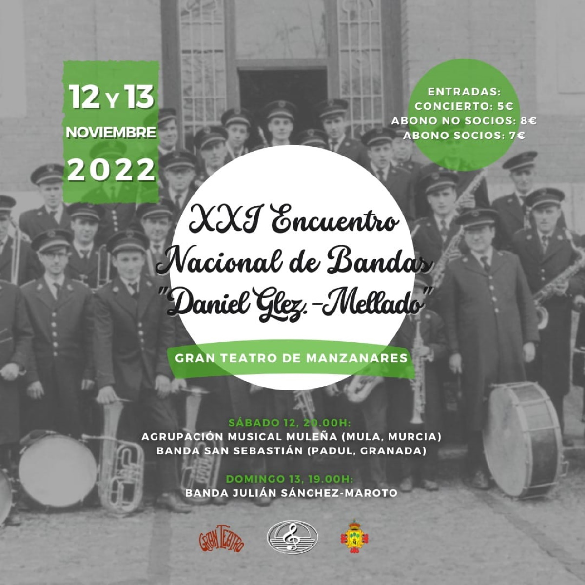 Este fin de semana llega la 21ª edición del Encuentro Nacional de Bandas ‘Daniel González-Mellado’ organizado por la AMC ‘Julián Sánchez Maroto’ al Gran Teatro de Manzanares (Ciudad Real). Un evento con motivo de la festividad de Santa Cecilia. El sábado, a partir de las 20 horas, se subirá al escenario la Agrupación Musical Muleña (de Mula, Murcia) y la Banda ‘San Sebastián’ (de Padul, Granada).